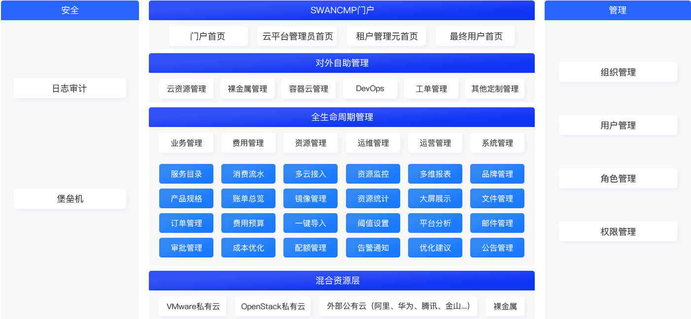 亚康万玮推出混合云管理平台SWANCMP,深度对接VMware私有云、Openstack私有云以及其他公有云,是一款面向政务云监管平台、企业私有云纳管以及大中型企业混合云建设等场景的云管理软件。SWANCMP提供从门户网站、服务目录展示到业务受理,再到资源开通和自助管理运维监控全过程,为客户实现多云资源的一站式管理和解决方案,帮客户实现“云”的赋能。